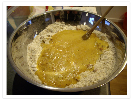 Next step is folding the frothy syrup mixture into the dried ingredients.
