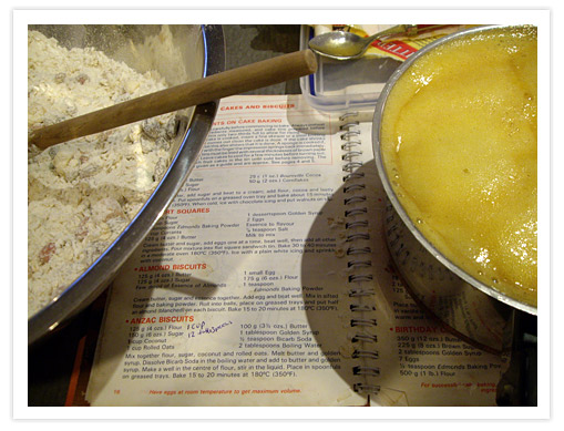 Here’s a domestic Christchurch pic today, which covers the process of baking Anzac biscuits (made in my kitchen at home in Christchurch). It’s not Anzac Day (April 25th) but any day is a good day to bake Anzac Biscuits.