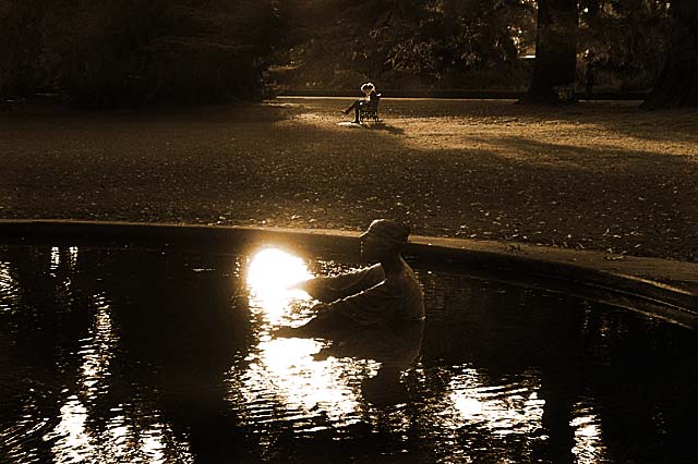 Something a little different. I took this quite late in the afternoon, and though I am really happy about the composition I turned the photo sepia as the colours were not quite right. The scene is Hagley Park around 5pm by the Archery Lawn. The sculpture in the pond is ‘Regret’.