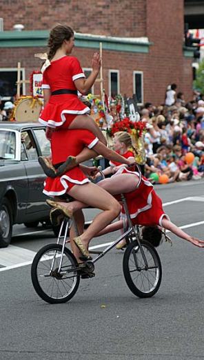 Some clever acrobats on bikes, and the police sorting out the traffic after the parade (with a big red bus in the background).