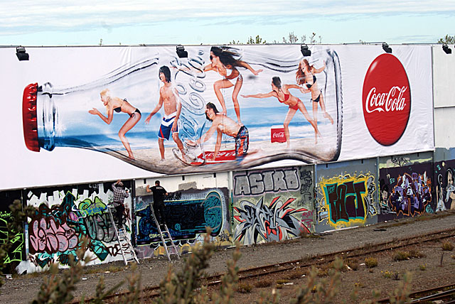 Love the combo of ad and graffiti.. which is which? Perhaps the men are adding more graffiti. Or ads.