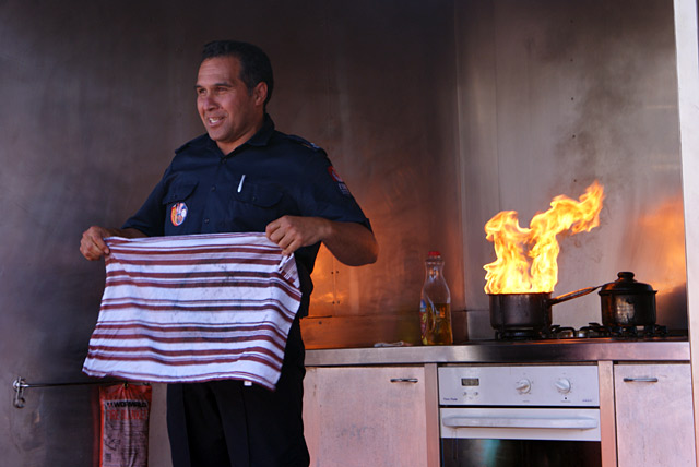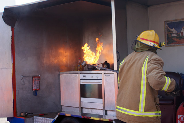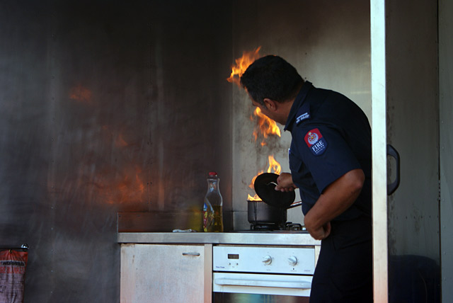 A Christchurch Fireman demonstrating how to put out an oil cooking fire. His advice was to put the lid back on it, call the fire department. As it will take 20 minutes for an oil fire to stop burning. He also used a wet towel over the top and then place the lid on.  He kept taking the lid off to demonstrate how the fire just took off again.  Quite a lesson to be learned here!  Never ever leave your cooking unattended, seriously folks too many people die uneccessarily because of just this issue.