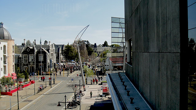 The Worcester Boulevard – looking out from the Christchurch Art Gallery – and looking down the Boulevard to the Arts Centre.