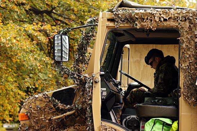 The army truck that is parked in front of one of the CBD barricades – I like how the camouflage is almost blending into the Autumn leaves. I didn’t notice the building being reflected into the mirror until I downloaded the picture!