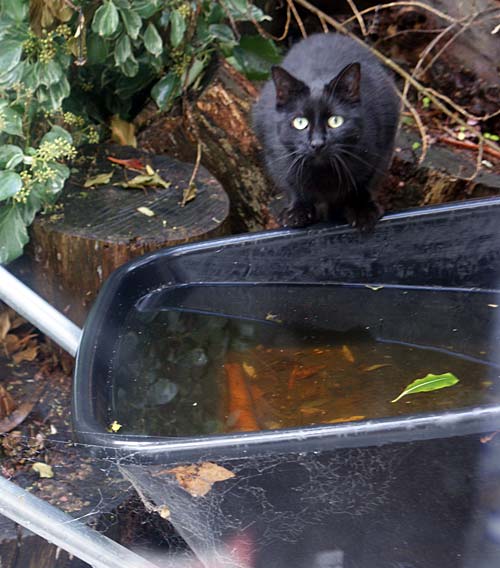 The next door neighbour has two cats (a little tabby) and this black one. Both of them roam over this side of the fence like it’s an extension of home, but they are both always surprised to see me – it doesn’t seem to matter how many times they see me watching them, they always act like they’ve just been busted doing something naughty. I’d been watching this wee guy have a drink out of the wheelbarrow but was not quick enough with the camera to capture him drinking – he darted away as soon as he realised he was being observed!