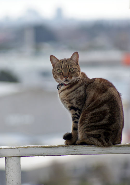 The neighbour’s cat likes to live dangerously (hope it has 9 lives!). I snapped it about 10 minutes ago sitting on the hand rail of our balcony which is about a 40 foot drop into scrub and bush. We’re visited most days by three neighbourhood cats. We’re not sure if they all live at the same house, but they do all seem to have little bells and name tags on them. This cat in particular has taken to sunning itself on our balcony chairs. Though it’s hanging out at our place quite a bit, it’s not the least bit interested in being friends. We think the cats are semi-wild due to their tail markings and behaviour. If we try to get close they scram! But they are fun to watch and are proving to be quite entertaining.