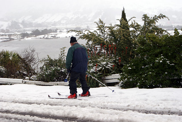 So overnight we had more snow and rather a lot of wind. We really get blown about a lot up on the hills and the sound of the trees swaying and the wind howling kept me awake for quite a while. I’ve just got back from a small adventure out into the snow – the fresh fall we had overnight is making everything look very pretty. The sun is currently shining, but it’s probably only temporary – we seem to get squalls come in every half hour or so. On my short walk down the hill I spotted this gentlemen skiing – he’d come quite a distance down Mt Pleasant and said he wasn’t looking forward to the walk back up very much!