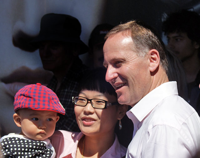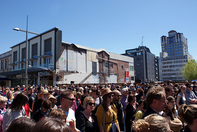 We’ve had a stunning day for the re-opening of the City Mall on Cashel Street – the sun shone the sky was blue and a big crowd turned up. It was hard for me to get good shots to show you just how many people were there – I’m in the middle of the crowd for the photo above standing on one of the benches they have in the mall. The mall was re-opened by our Prime Minister John Key (who was later mobbed by people who wanted photos with him – I think he may have even kissed a baby or two!).
