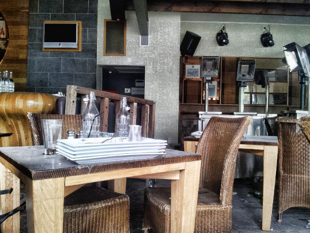 This is what was the Tap Room, and it’s one of the remaining bars on Oxford Terrace (the spot that I knew in the 90’s as ‘The Strip’). It’s right beside the Re-Start container shopping mall – so people are draw to it and have a look inside through the windows. It’s quite an eerie scene – with half drunk glasses of wine on a table and some guy’s hat on another. Dishes are stacked up and ready to be taken to the kitchen – but clearly they never got there, mother nature intervened and people would have just picked up and made a run for it.