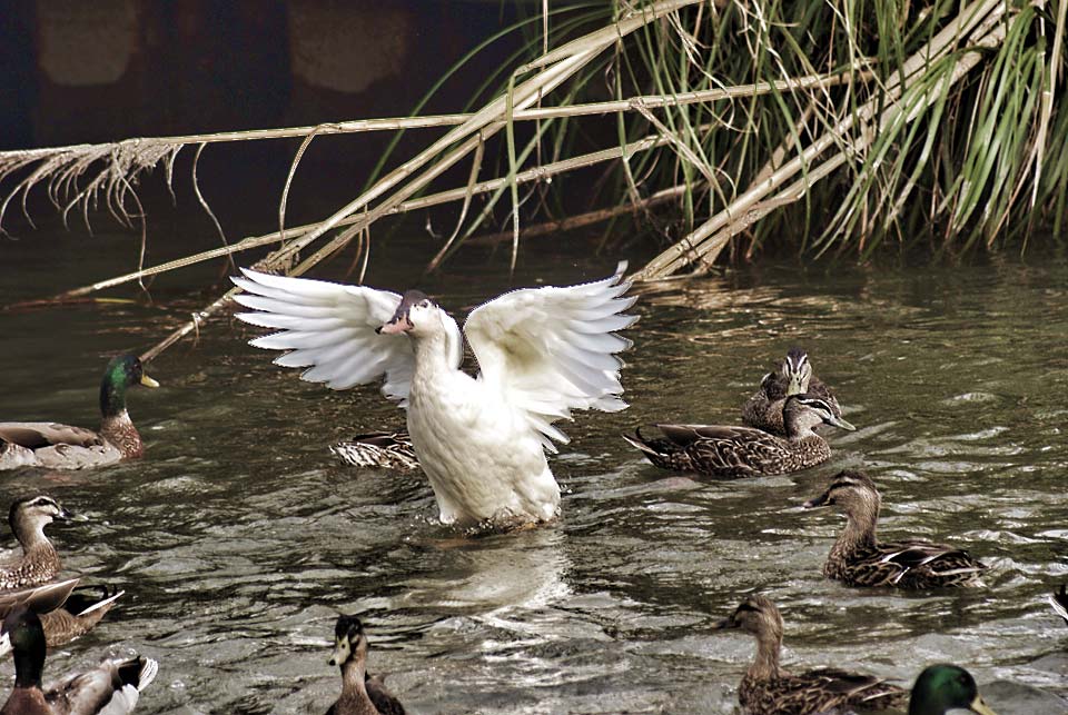 This is one of the white ducks that lives on the canal that runs along Humphreys Drive by Charlesworth Reserve. The ducks are very well fed – in the 10 or so minutes I was photographing them at least two groups of people stopped to feed them from the bridge that goes over the canal.