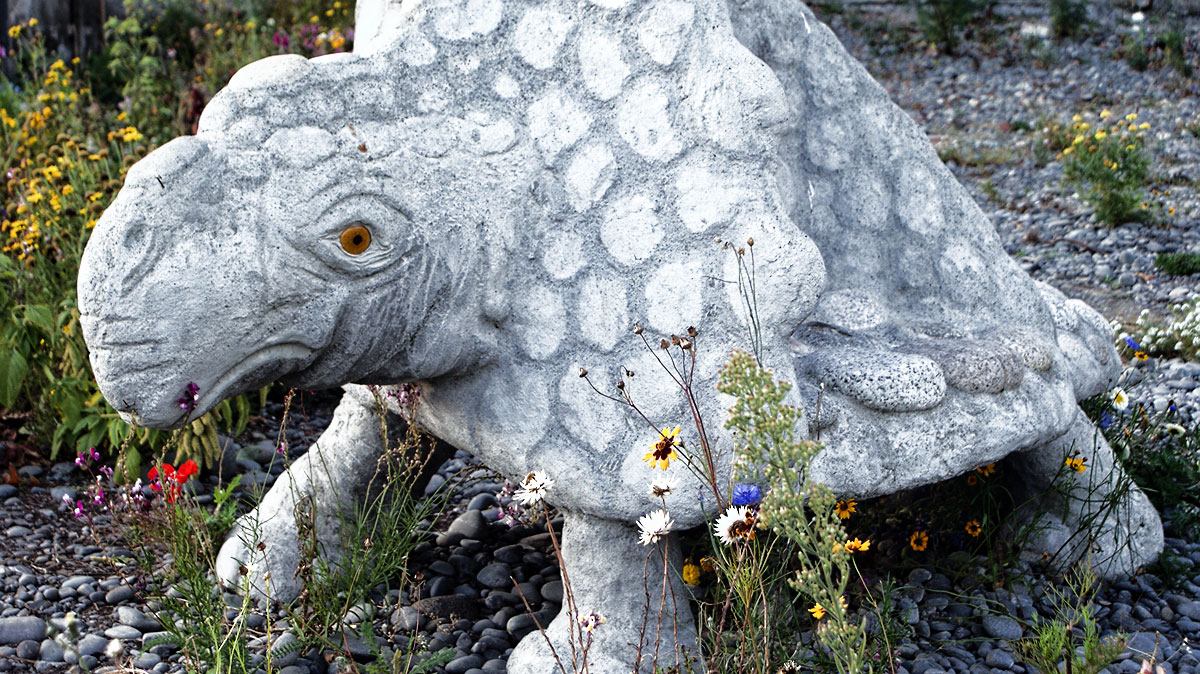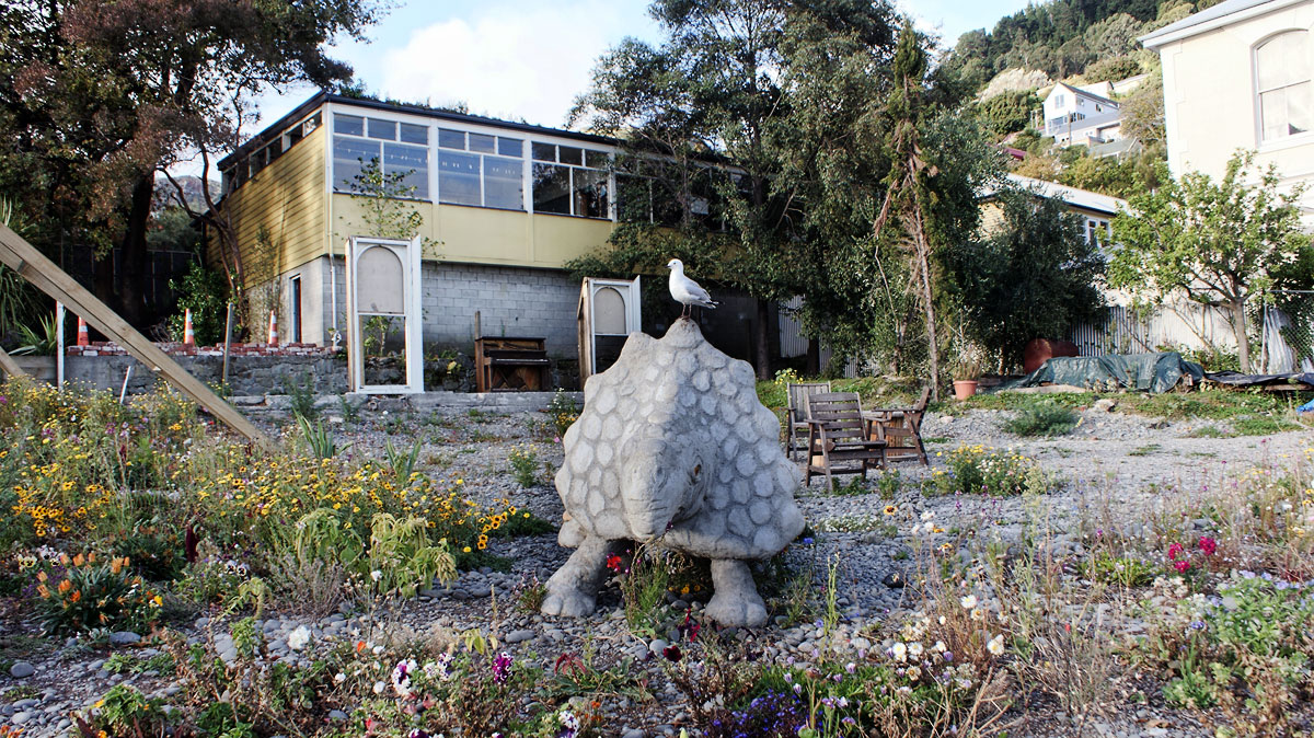 Spotted in a vacant lot in Lyttelton. Something resembling a dinosaur crossed with a tortoise? Well the seagull was a fan of it whatever it is.