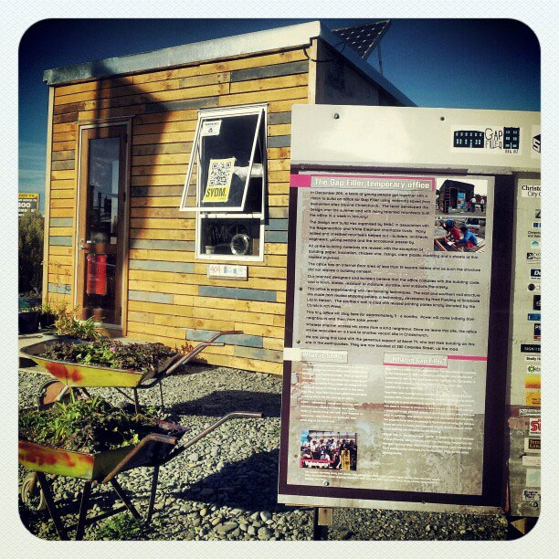 I was in Sydenham today so took a quick cellphone snap of the office for Gap Filler (this is the organisation that fills empty lots with creative things like painted pianos). I’ve tweaked the photo a bit using Instagram which I have only started using as they’ve recently released their app for Android phones so I can now use it on my Samsung Galaxy.
