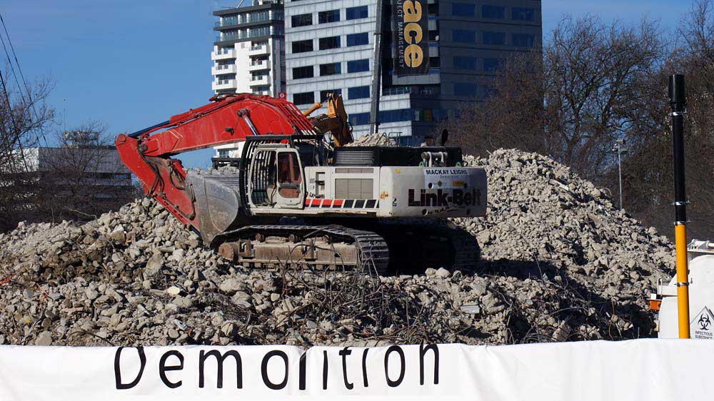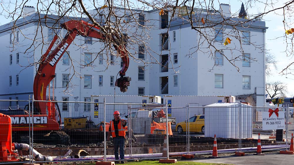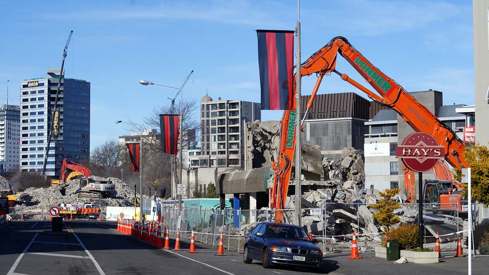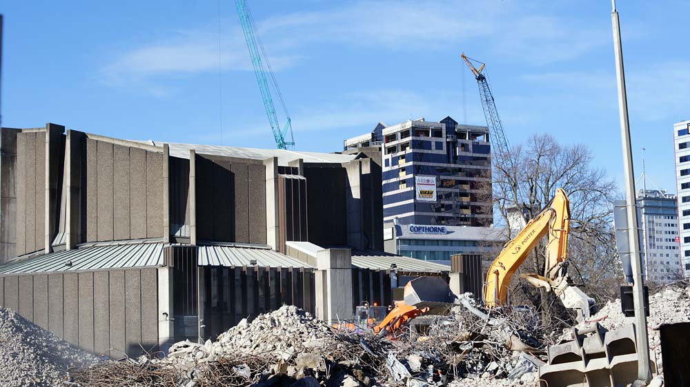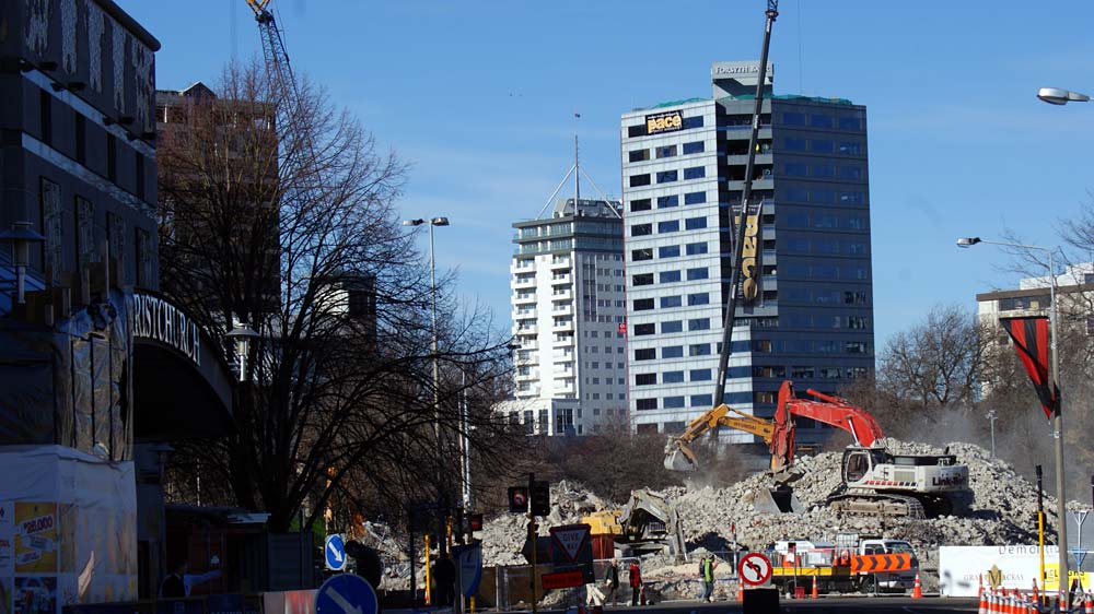 I took a walk down Victoria Street today – starting from near the Salisbury Street intersection. I was wondering how much of the Forsyth Barr building could be seen (most of it) and whether the rubble left over the Crown Plaza demolition was still there (yes, still quite a bit).