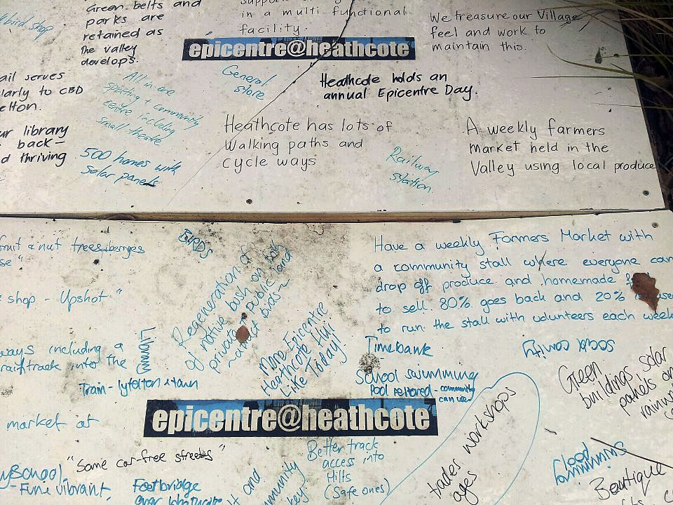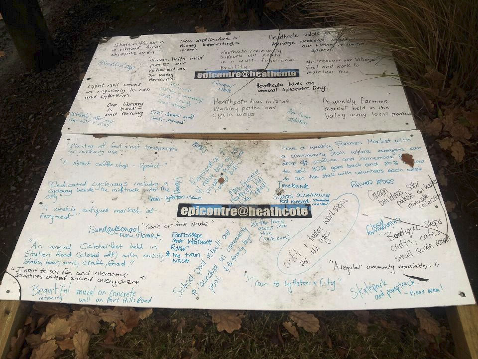 I was out for a run in Heathcote when I came across this billboard / whiteboard that must have been used for getting ideas from locals when they had the epicentre event. Some wonderful ideas here. Shame it’s been forgotten or perhaps just misplaced..