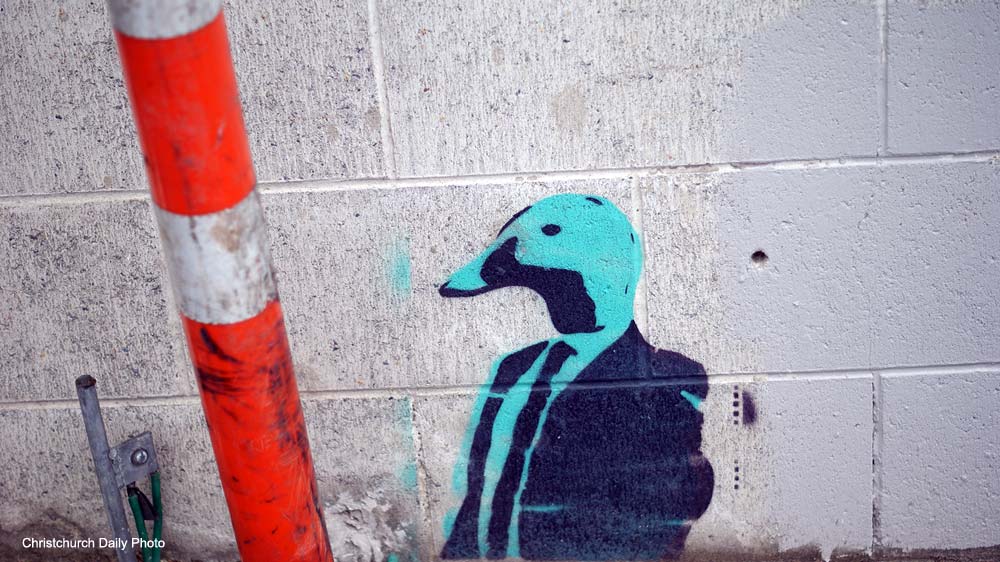 Spotted today on an empty lot that’s being used as a car park on Colombo Street. And now for his close up…