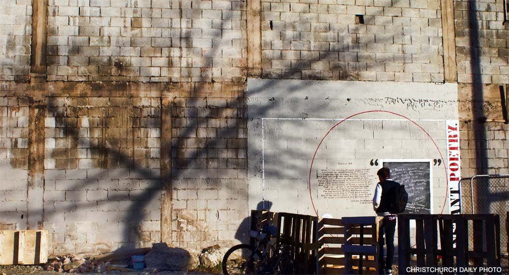 This wall is now an Instant Poetry Wall where anyone can leave their poems. It is a project from Poetica Christchurch and Gap Filler. I got there late afternoon with the shadow of the tree making for a dramatic effect.