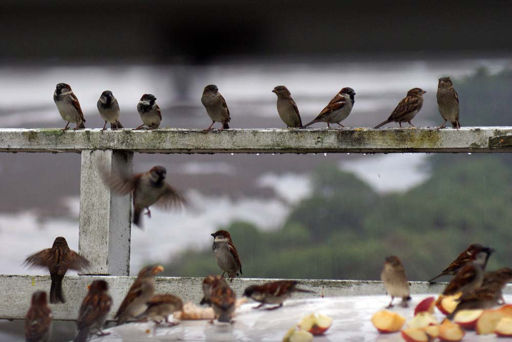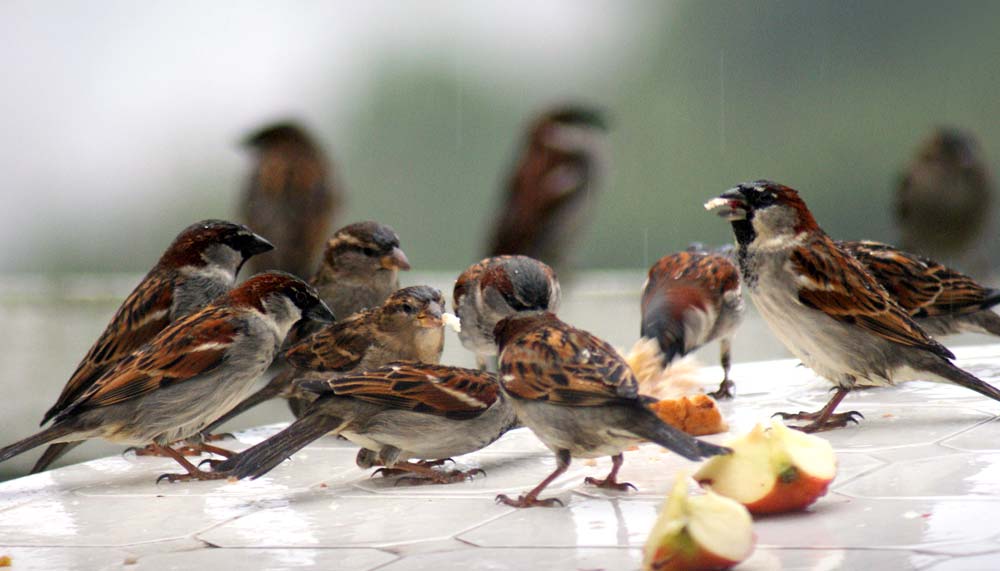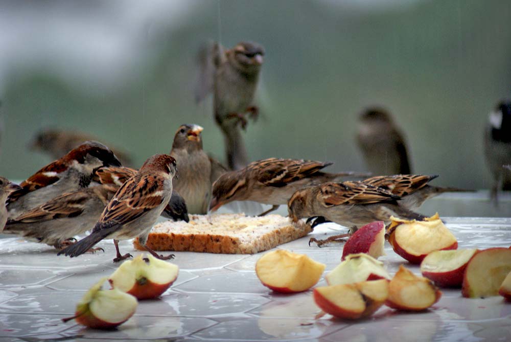It’s been raining for days on end, so I took pity on the sparrows and threw out some bread and butter (and apple) for them. As you can see, it was pretty popular.
