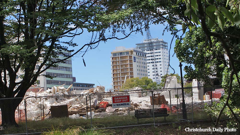 Every couple of weeks my partner Bruce and I venture into the central city for our ‘cordon walk’. That’s where we walk around the perimeter of the ‘red zone’ of the central city. There can be dramatic changes even in just a few weeks between visits, with new and weird vistas becoming available to us as buildings are removed. For example, if you stand in Victoria Square and look east, you can now see part of the New Regent Street buildings. We focused on Victoria Street today – going up the street and then into Victoria Park and then eventually along Durham Street up to the Re-Start Mall.