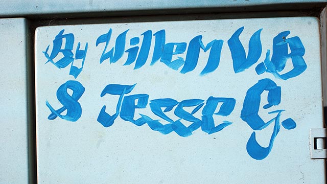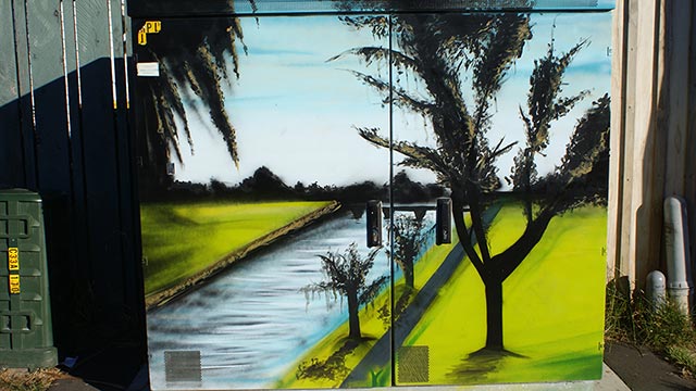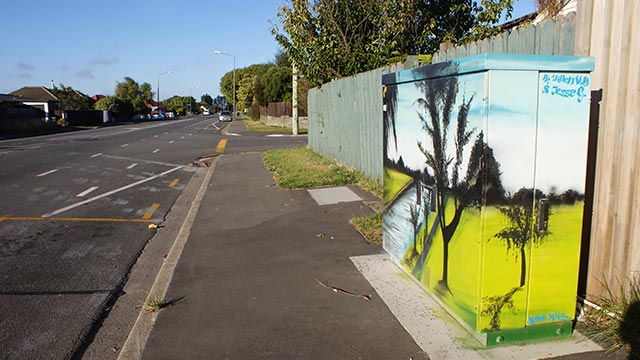 This phone junction box is on Rutherford Street in Woolston. I noticed the mural months ago and have been meaning to stop and photograph it. I can’t recall when I first saw it. It’s rather well done and according to the names on the mural it is by Willem VB and Jesse G.