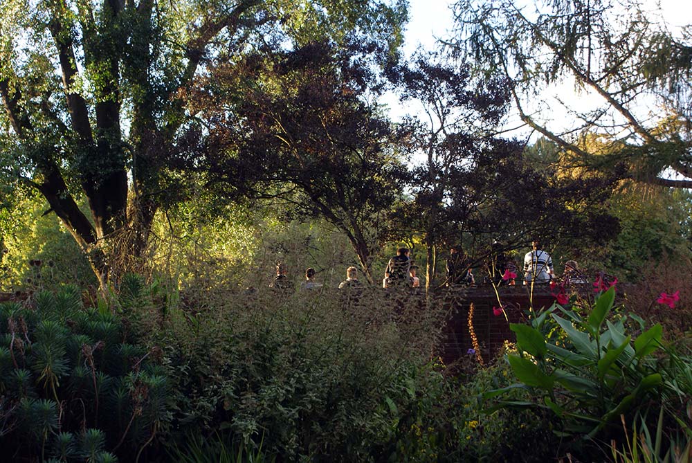 A group of school boys sit on the fence between Christ’s College and the Botanic Gardens watching a game of rugby.