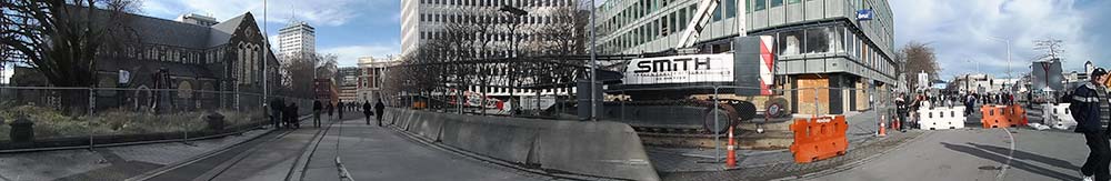 A panorama taken on Colombo Street looking at the back of the Cathedral.
