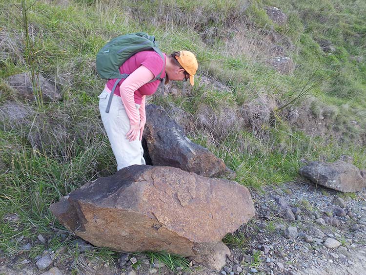 I introduced a friend to the Bridle Path walk today and her keen powers of observation meant that she spotted a mark on a rock which I would have completely missed. It looks like a blast mark – and it has a pin type hole in it. So we guess these rocks were blasted off the side of the hill. There’s a note about continued rock blasting by the entrance to another track that goes off the Bridle Path. In fact there was a loud blast when I walked up the hill last week (it was the only thing that made me stop for a second or two!).