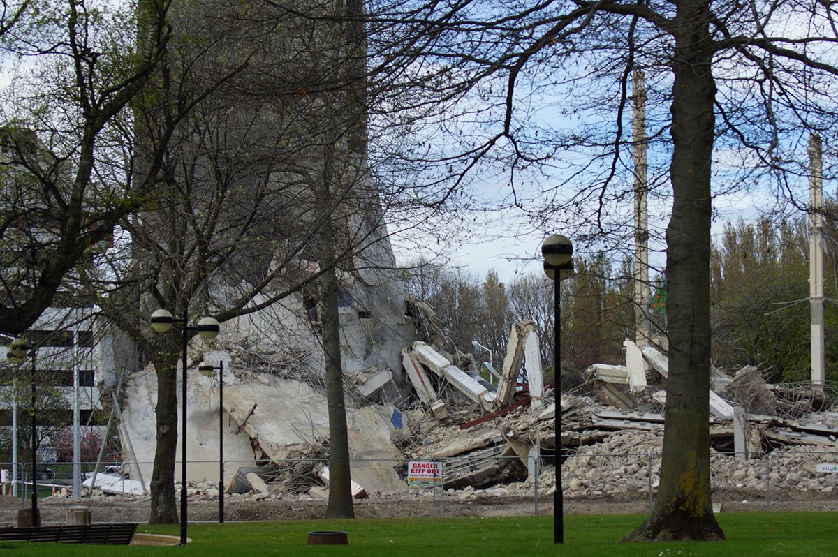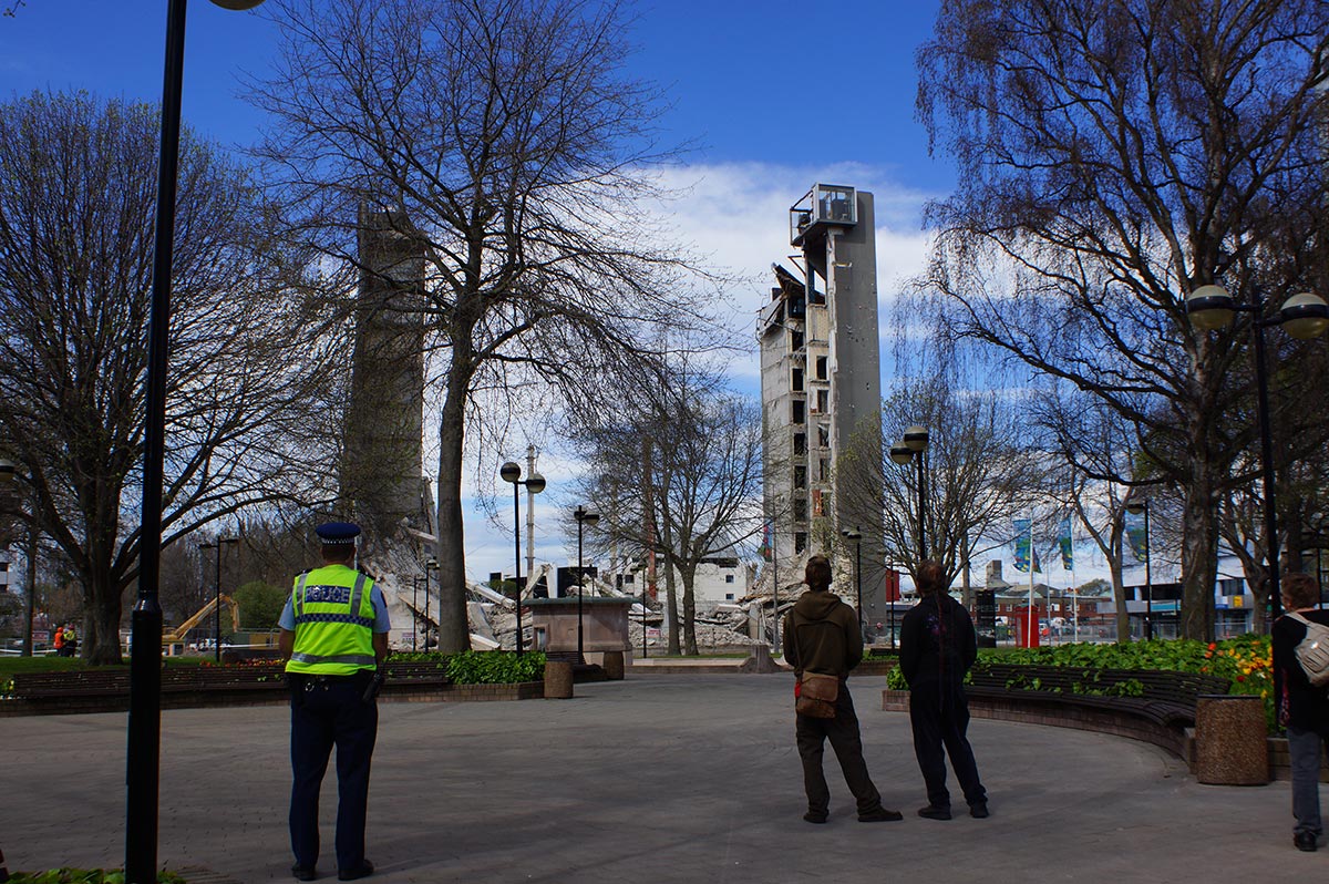 This is the Copthorne Hotel on Colombo Street opposite Victoria Square. It was being demolished today when something went wrong. The building collapsed or ‘pancaked’ and the demo workers had to make a run for it. Fortunately, no one was hurt, but I’m sure they got the fright of their lives. I actually didn’t see it come down and didn’t know it was being demolished. I was simply out for my regular weekend walk around the city. I walked into Victoria Square and realised immediately that this didn’t look right! There were also police there – making sure no one got too close to the building as it could fall down at any time.