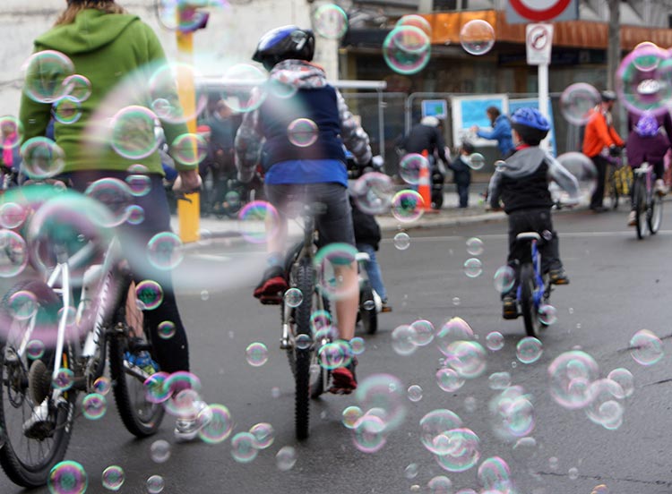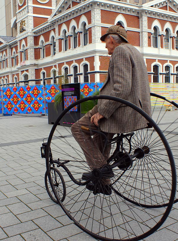 Today, several of our inner-city streets were closed to cars so that people could walk and bicycle freely around the city. Despite the iffy weather (grey clouds and the chance of rain) people came out with their bikes of all types and there was a parade with Frocks on Bikes and the Bicycle Band.