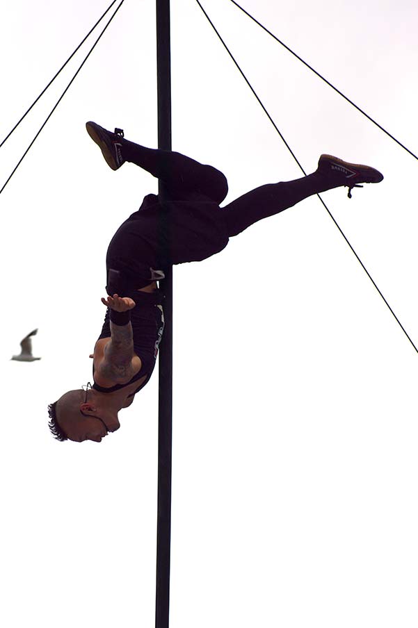 Acrobat Reuben DotDotDot performing an impressive act on a Chinese Pole at the Busker Festival, with a bird flying in the background.