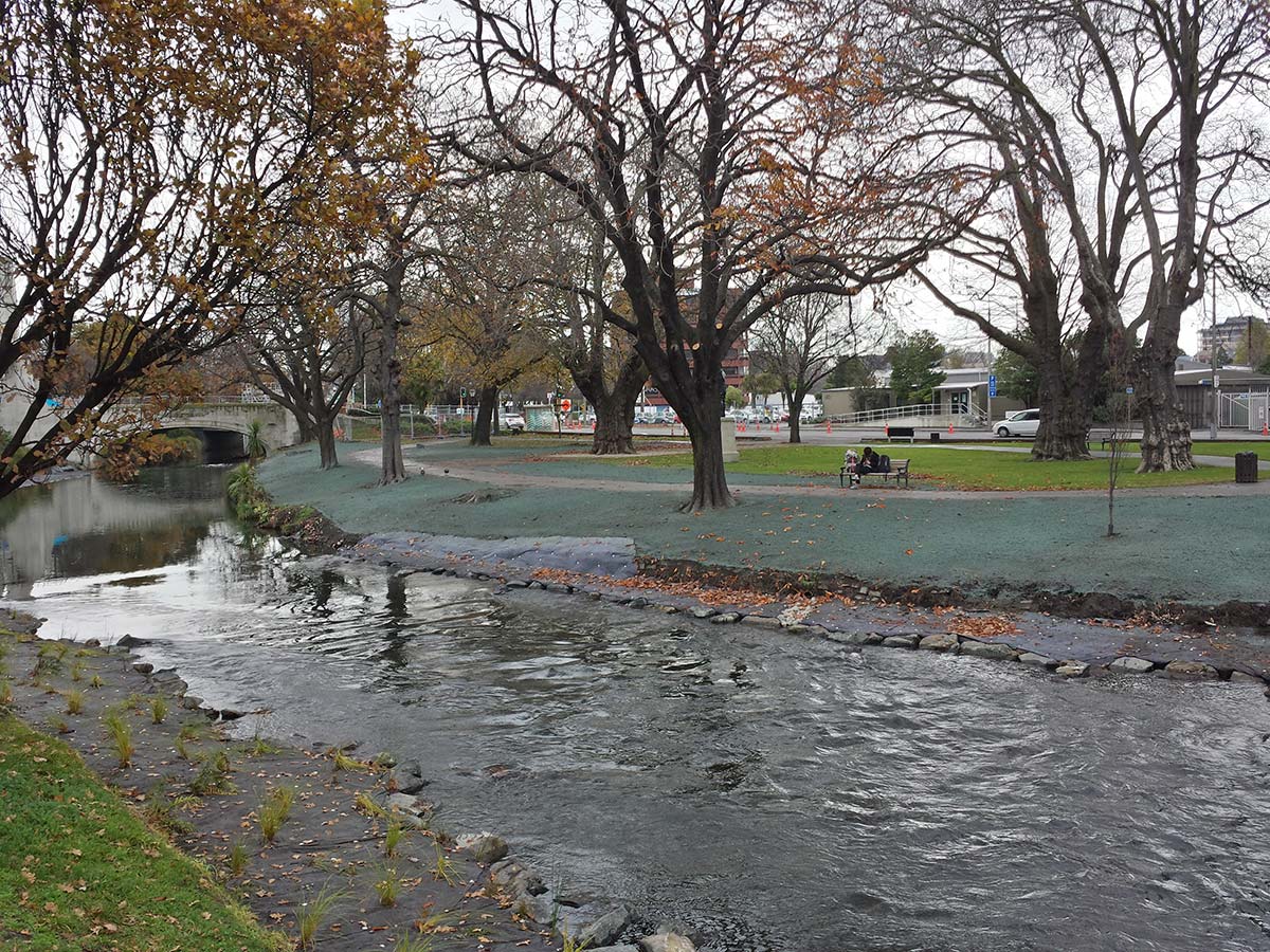 They’ve been working on this stretch of the Avon River as part of the river re-development. It has been narrowed and is now flowing a lot faster. The increased flow will help improve the quality of the water and bring back the natural eco-system. The area to the left (out of shot) will eventually have terraced seating on it. Looks like they’ve finished working in the right hand side as it has been grass seed on it now. There is tussock planting on the banks. It’s going to be exciting to see this area develop further.