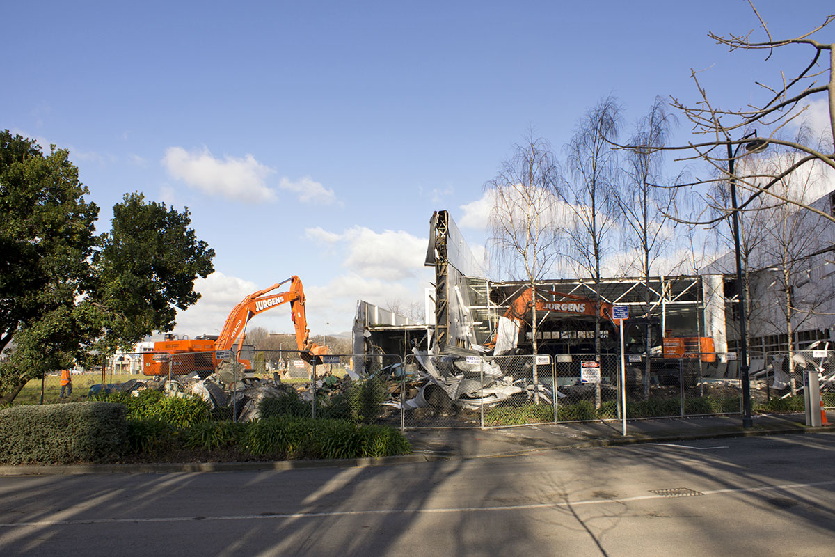 The Centennial Pool demolition is in progress. From what I understand, the pool was not economic to repair due to earthquake damage. The land the pool is on will become a new and very large and innovative Children’s Playground – to be named in honour of the children’s author Margaret Mahy