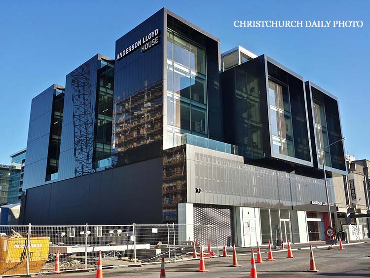 This is a new building on Gloucester Street. Local law firm Anderson Lloyd have taken naming rights on the building and are now located in the building after operating from a converted warehouse for three hours (after our quakes). According to their website the building was “developed by Amherst Properties, designed by international architects Fourfoursixsix, and built by Ganellen.”