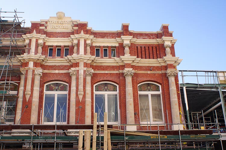 The Isaac Theatre Royal building undergoing restoration with scaffolding removed, showcasing its red brick facade and new construction elements on Gloucester Street.