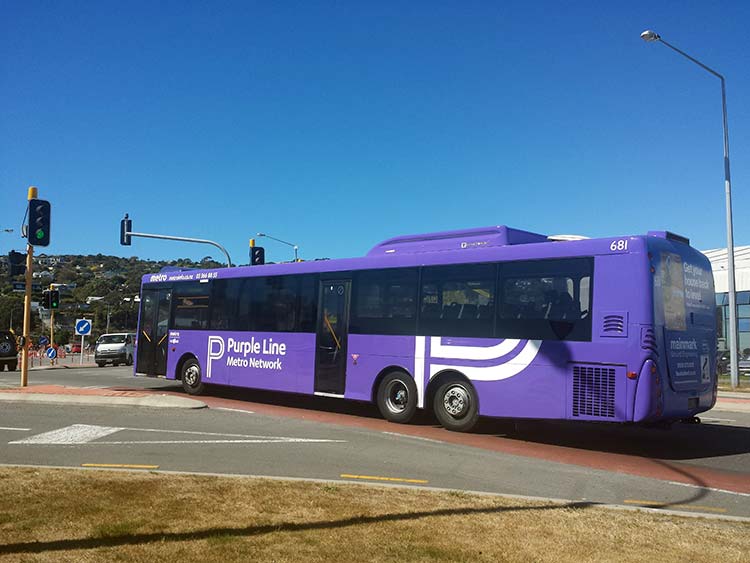 This is a bus that runs the Purple Line which goes to Sumner and the Airport. The buses were painted a few months ago to reflect the changes to the bus network. There are also, Blue, Orange and Yellow lines. Certainly makes it a lot easier to spot your bus!