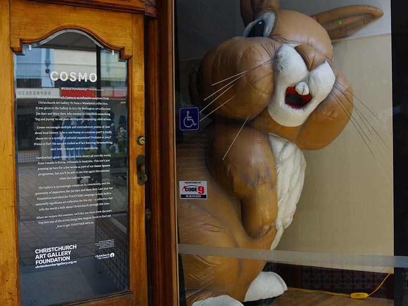 Cosmo is an inflatable rabbit by artist Michael Parekowhai. Cosmo was gifted to the Christchurch art gallery by Jim and Mary Barr for the Art Gallery’s post-earthquake reopening back in 2011 (the art gallery is currently closed for earthquake repair work). He currently lives at 31 New Regent street as part of the art gallery’s Outer Spaces programme.