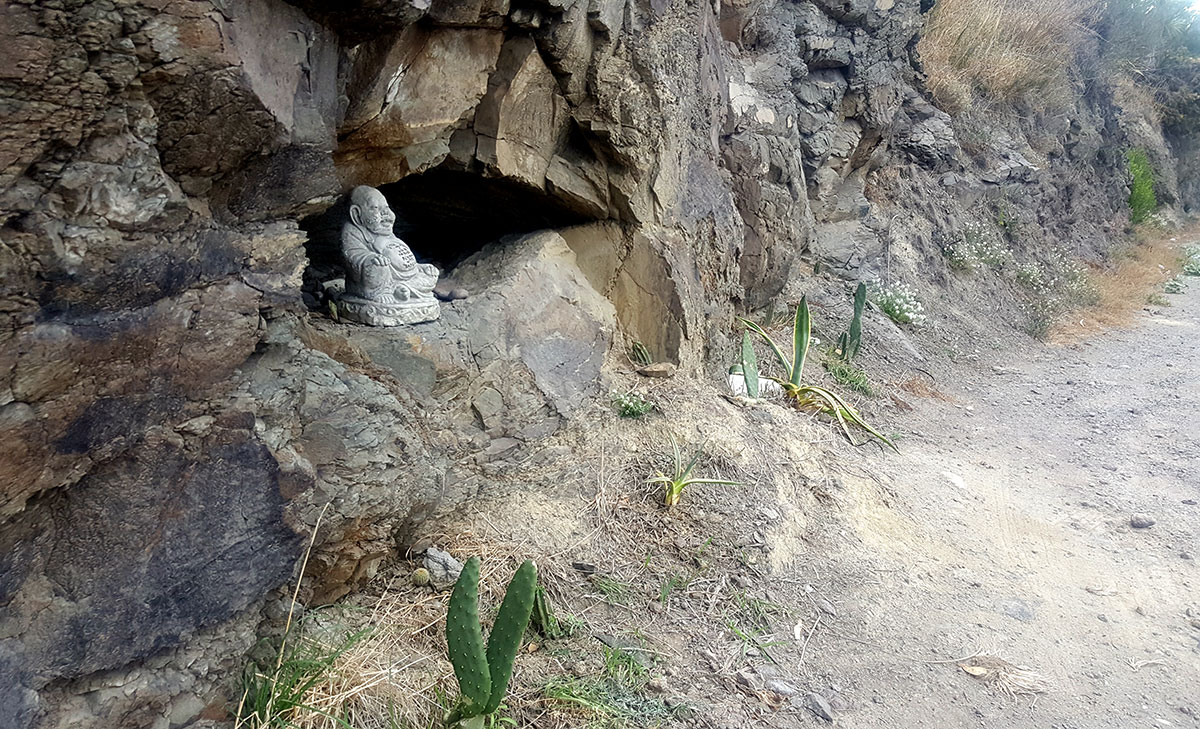 A while back (not sure when) I noticed this Buddha had been placed in the rocks along Bridle Path Road. I’d seen another Buddha down by the river (so I’m assuming it’s the same one). I also only recently noticed that someone has been planting cactus plants along this strip.