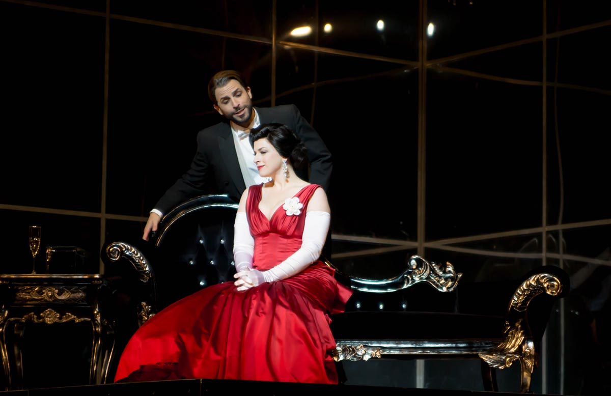 The photos feature members of the chorus and Madeleine Pierard as the courtesan Violetta Valéry and Enea Scala as Alfredo Germont (her love).