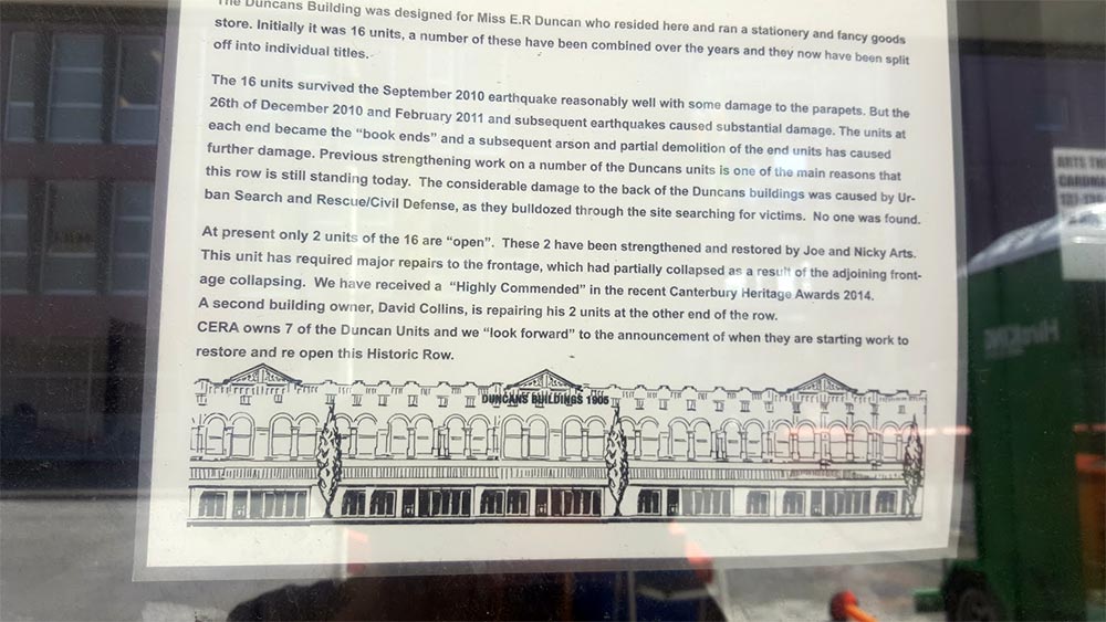 The Duncans Building is an historic row of 16 units on High Street. The two units at the far left have been restored by Joe and Nicky Arts (according to the sign on the door of the building). Another two units at the other end of the row are being restored by another owner. The remaining units are owned by the Crown. According to this article in the Press there are developers interested in restoring the rest of the units.