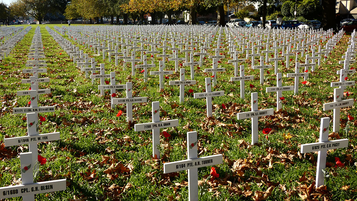 These crosses in Cranmer Square bear the names of New Zealanders from the Canterbury region who were killed in action during 1915-1916.