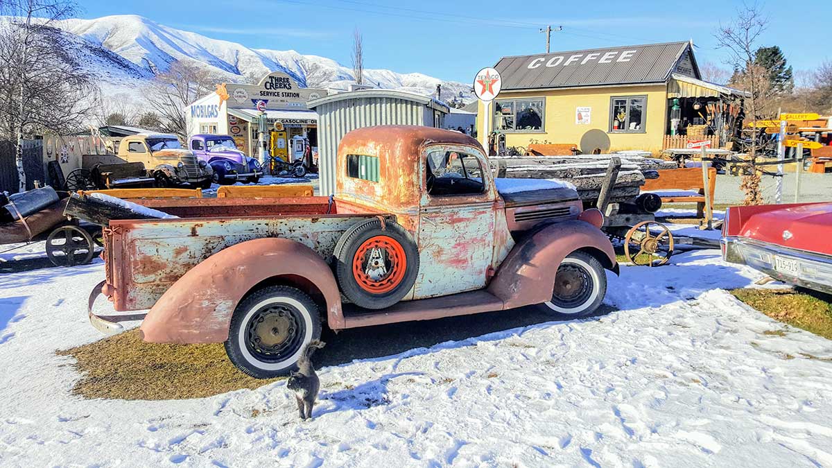 I had a mini-break to Tekapo this weekend and it was a stunning destination with snow right down to the ground – making everything look like a winter fairyland (I’ll post photos this week sometime). On the way back to Christchurch I decided I absolutely had to have a coffee stop at Burkes Pass to check out the vintage cars and the shop there (I came home with a few things!). This place is a photographer’s dream – especially with the snow on the vehicles.