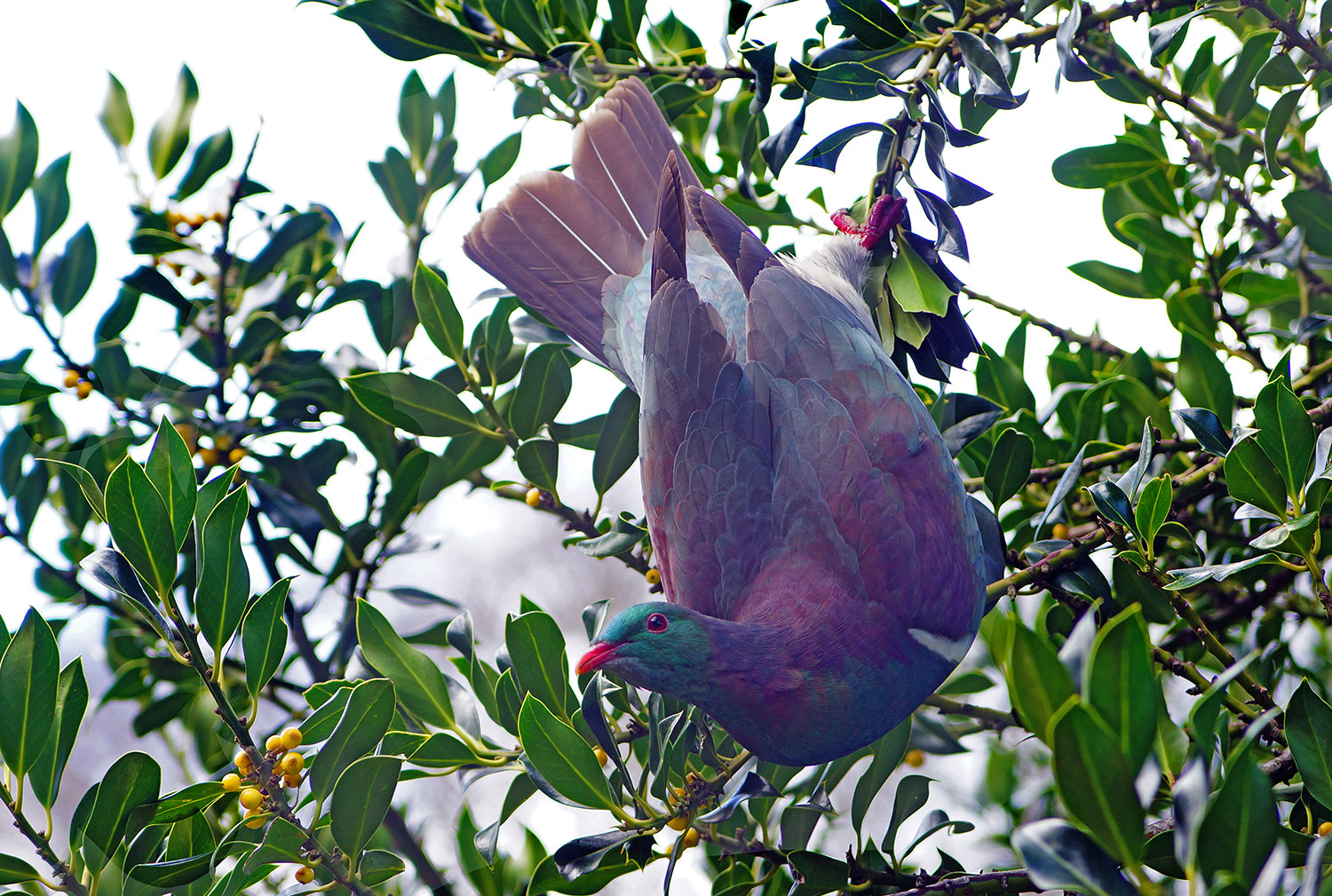 I went to the Botanic Gardens today with the intention of photographing the early spring flowers. So I never expected to come home with this shot… but that’s the fun of photography, sometimes you are just in the right place at the right time. I had no idea the Kereru was even in the tree initially – as I was focused on photographing the berries on the tree (I took a very out of focus picture of that!). The kereru would have been maybe 4 feet above me in the tree – close enough for me to be startled and then worried that it was going to fly into me. The bird was completely oblivious to me as I was filming it (I think there’s something about the camera that makes them disregard me as a threat), but it was very aware that an older lady was standing behind me watching me filming. The lady was amazed as I was about how close and clumsy the bird was. And then off she flew (the bird not the lady).