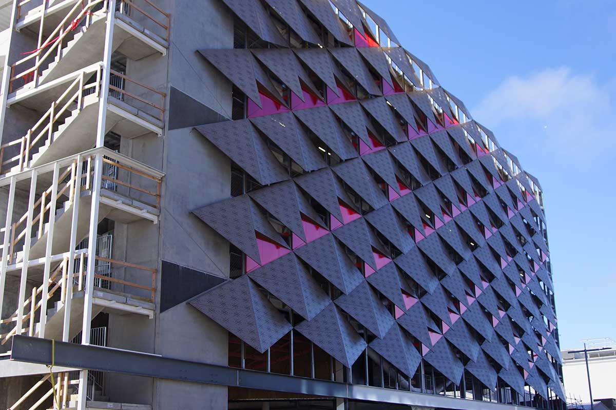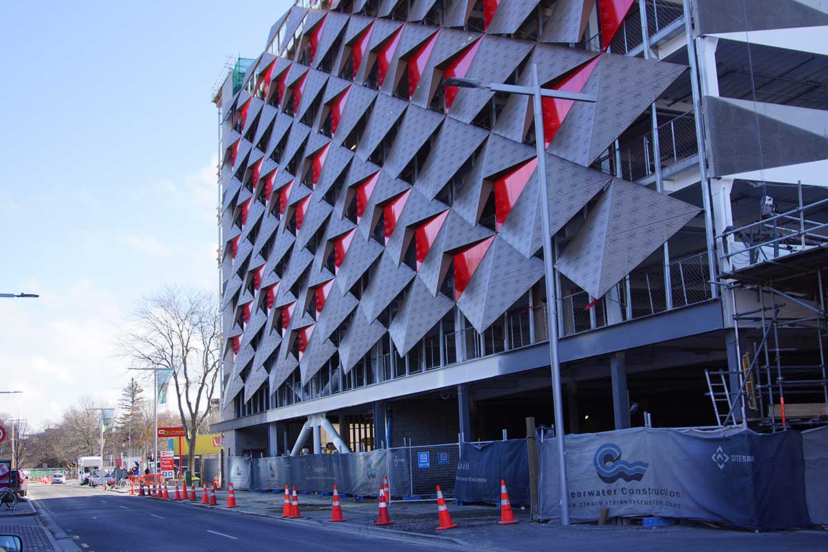 “7 floors, with 6 floors of carparks and the ground floor for retail. The building is being constructed predominantly of structural steel and concrete. This is a unique carpark in the sense that it is being ‘future proofed’ through the incoporation of designing for electric car charging bays, and drop off points for driverless cars. Clearwater Construction