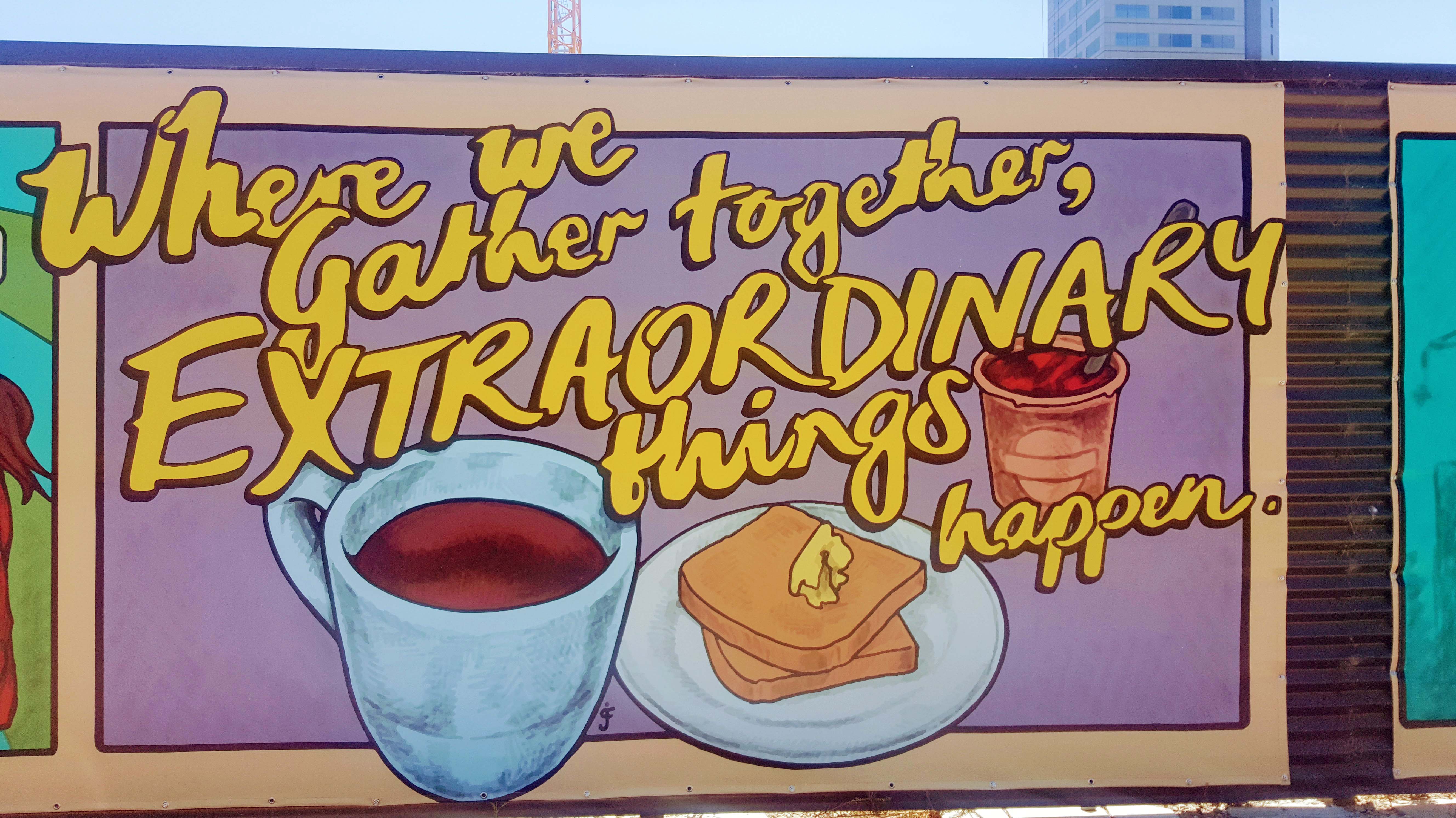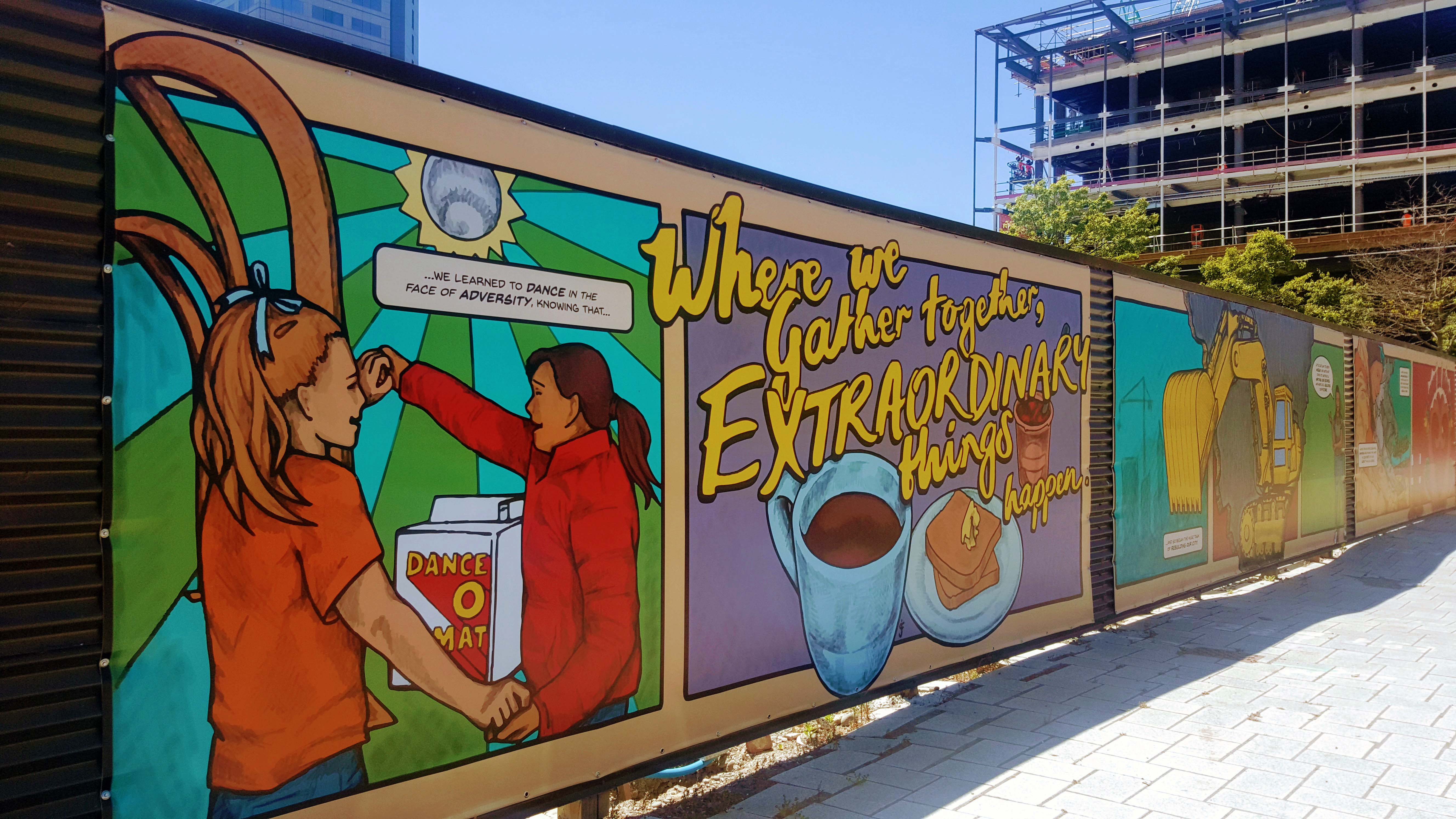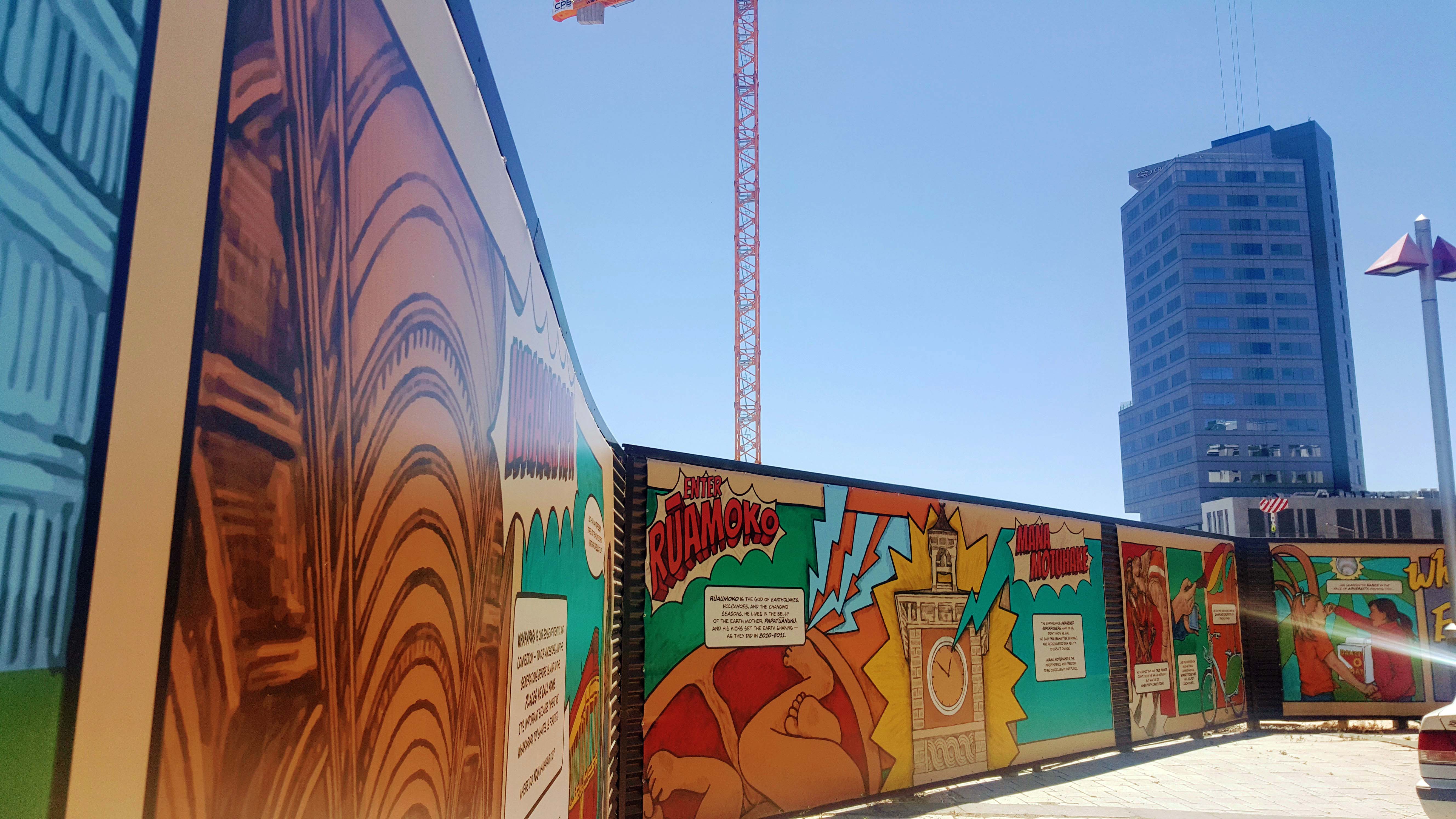 These colourful comic book panels can be seen on the wall alongside the convention centre building site. They are on Colombo Street and section that faces into the square. It is a commissioned artwork produced by Felicity Jane Powell of RE:Edit Publishing.