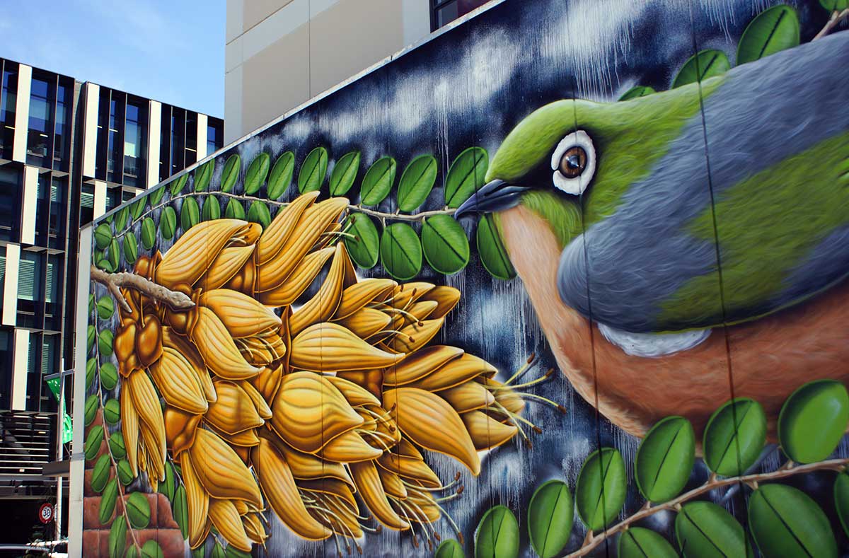 This stunning mural of a silver eye bird and kowhai flower can be seen on Hereford Street on the wall of the Ibis Hotel. It was painted by street artist Brandon Warrell and was part of a design competition run by the city council and voted on by public vote. See https://ccc.govt.nz/news-and-events/newsline/show/2236 for more about the artwork and the artist.