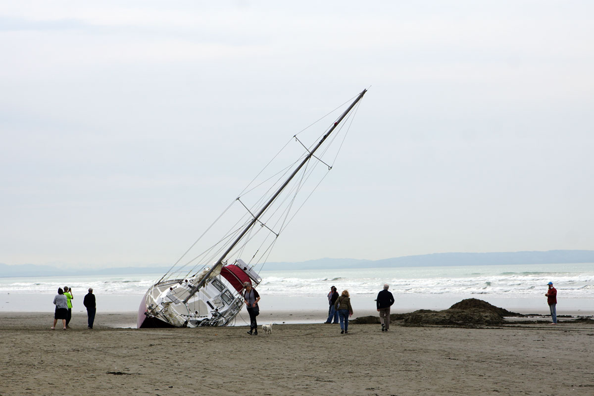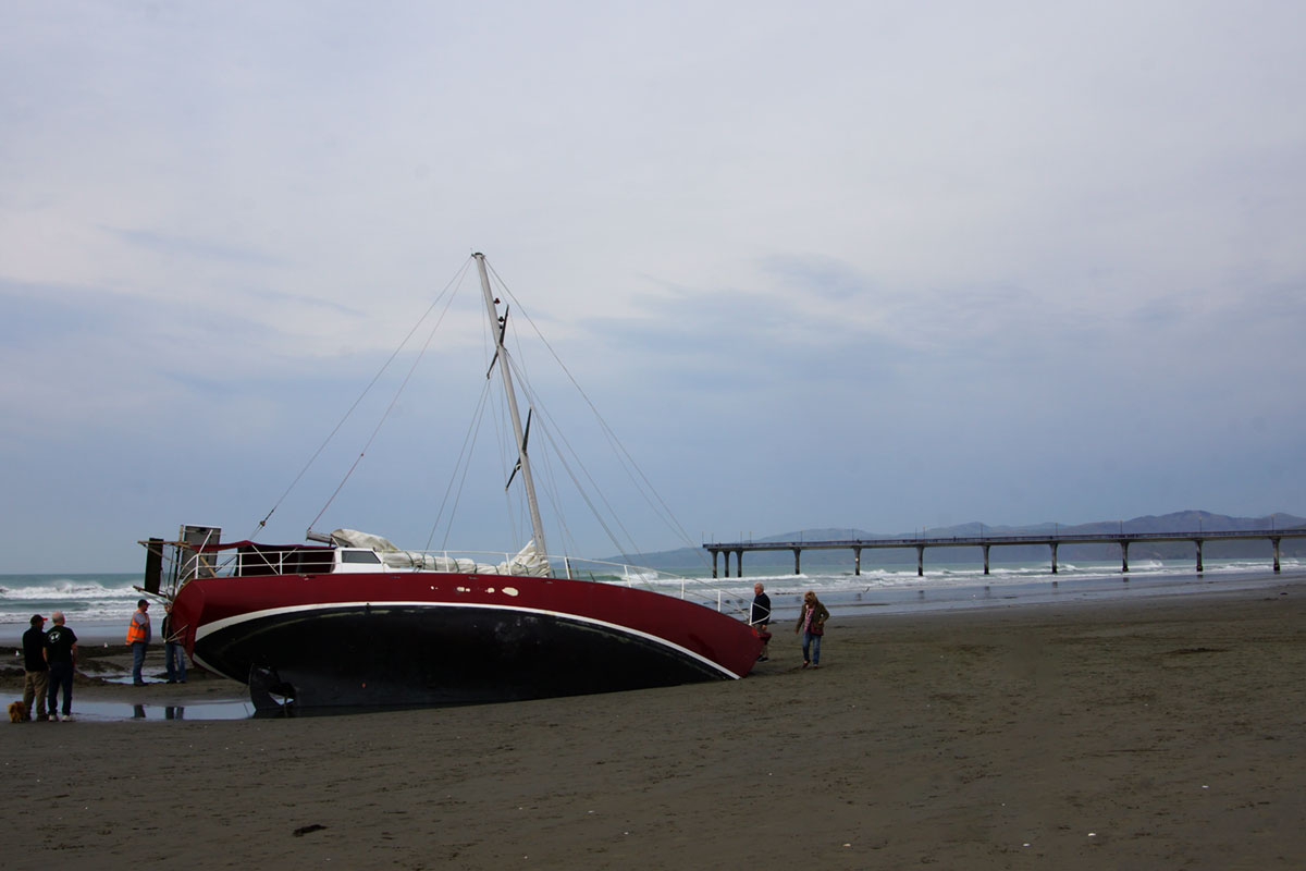 A friend of mine alerted me to this yacht grounded on New Brighton beach this morning so I had to go and have a look – as it was certainly an odd sight. According to news reports, the skipper of the yacht swam about 100m to the beach and was showing signs of possible hypothermia. I saw photos of a gravel loader trying to move the yacht – but in typical fashion, it got stuck as well. I had visions of even larger vehicles arriving to also get stuck and so on and so on! Alas, by the time I got to the beach the loader was gone. I suspect the yacht may stay where it is for a few days.