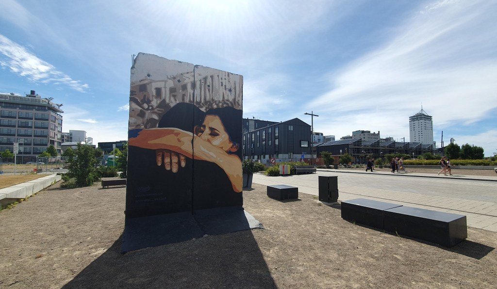 This is a temporary mural on one side of the Berlin Mall segment that’s in Raurora Park (off Manchester Street). The artwork is by artist Nadia Veleska – see https://www.nadiavaleska.com/berlinwallinfoenglish for more information on the meaning of the mural. I rather liked the lens flare effect I got from the sun on the first picture I took.