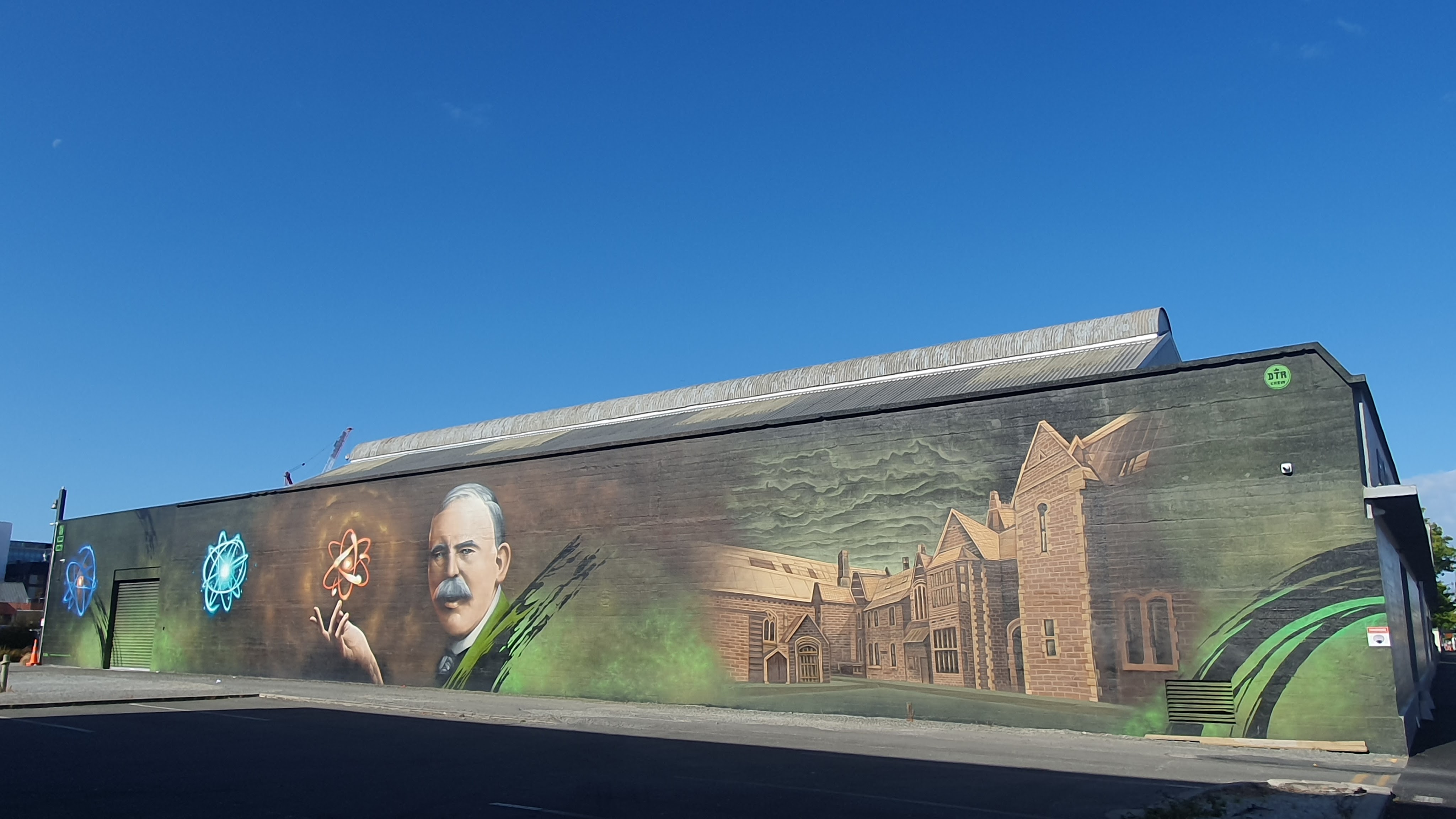 You can see this wonderful mural of Ernest Rutherford at 186 Tuam Street. It was created as part of the Flare Street Art festival.
