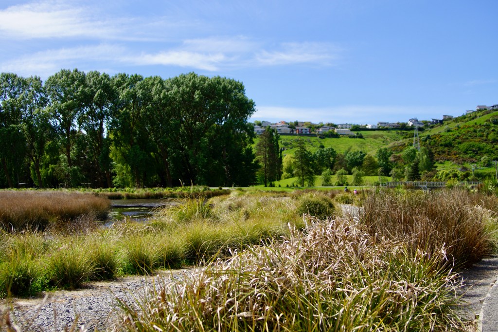 We took a walk around Te Kuru Wetlands in Halswell today. The wetlands capture and treat stormwater and reduces the risk of flooding – particularly of the Heathcote river. It’s planted extensively in New Zealand native plants and has wide flat paths for walkers and cyclists. Today was the perfect weather for a look around.