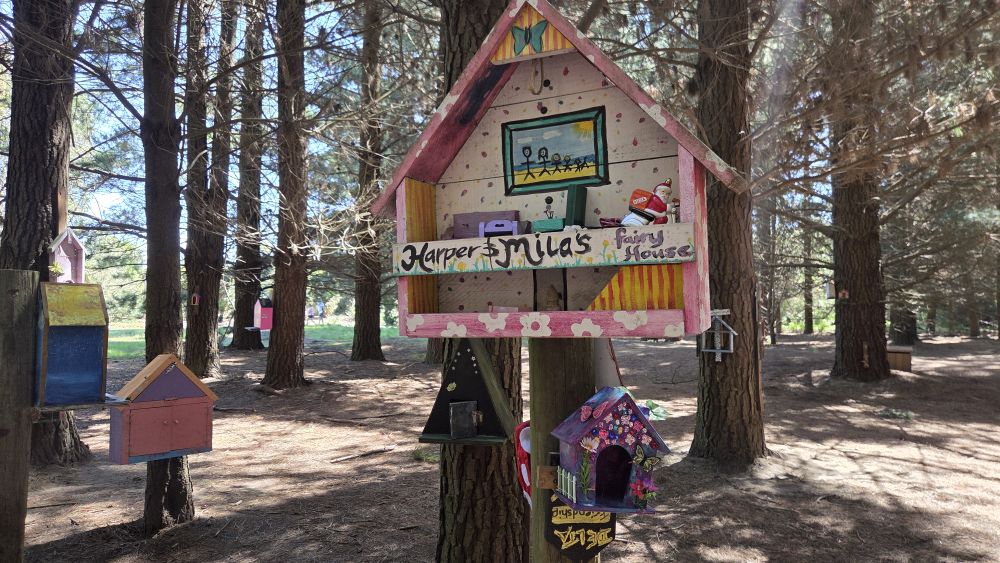 Tucked between the tall pines and sandy tracks of Bottle Lake Forest is something completely unexpected — a tiny fairy village. People are welcome to add their own fairy houses or doors.
